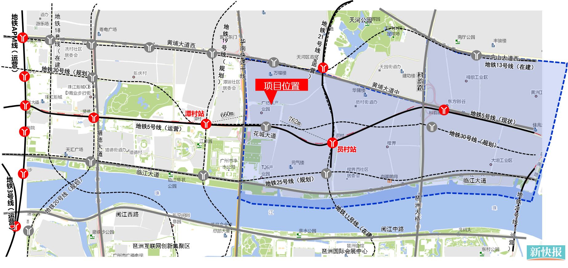 项目位于广州人工智能与数字经济试验区(广州国际金融城),处于中心城区,地理和交通区位优越,可通过华南快速干线、花城大道和地铁5号线联系周边。规划范围北至员村西街,南至花城大道,东至员村南街(员村大道),西至华南快速干线,用地面积为11.09公顷,范围涉及天河区AT0805规划管理单元。