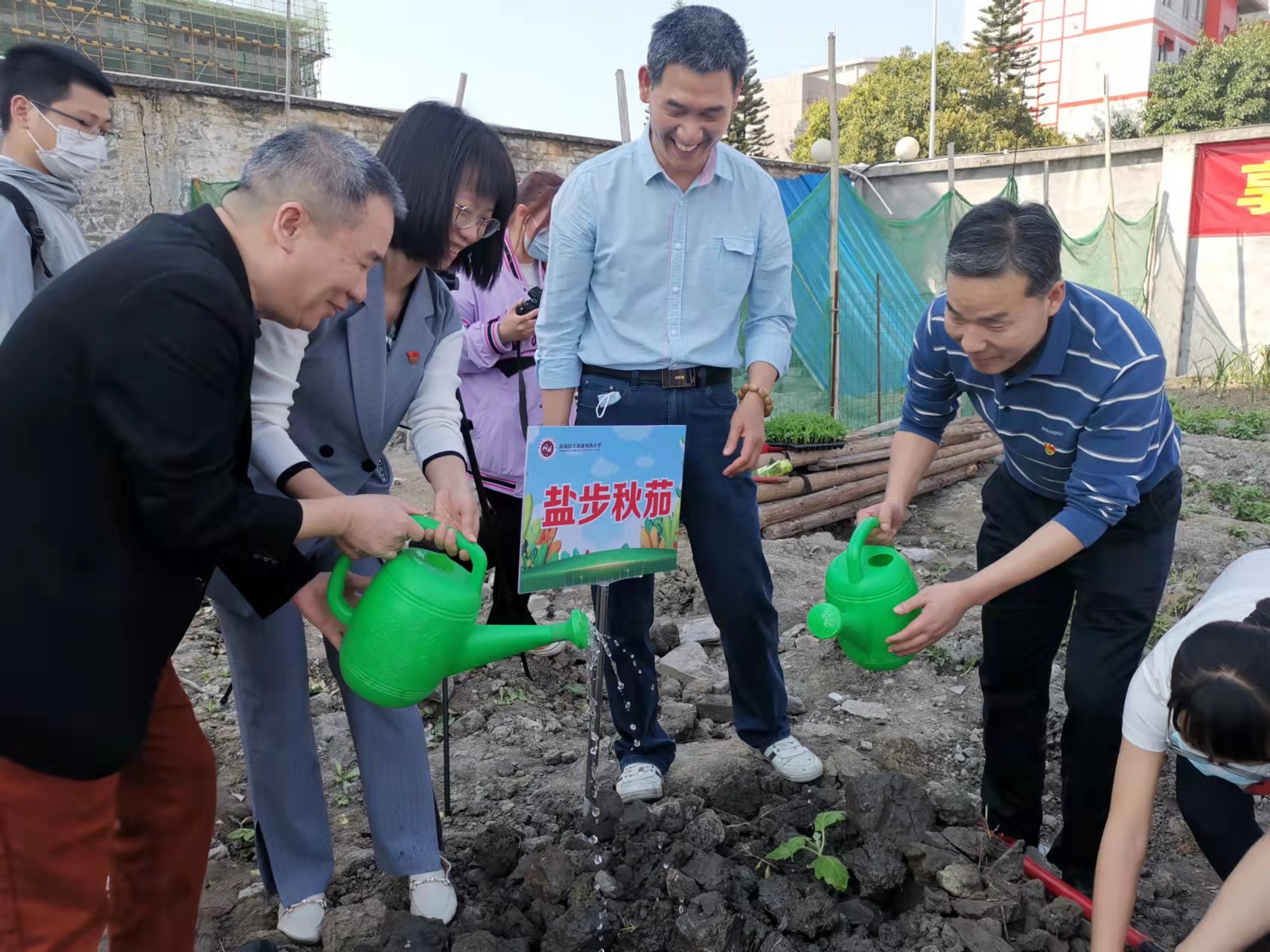 大人小孩个个干劲十足,挥动铁锹铲土、培土,种下菜苗,压土、浇水,彼此相互协作,分工明确、有条不紊,到处都是忙碌的身影和劳动的欢声笑语。