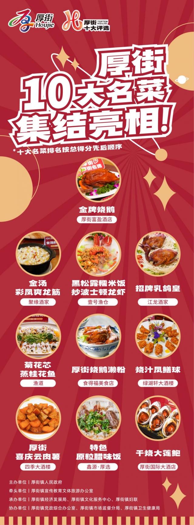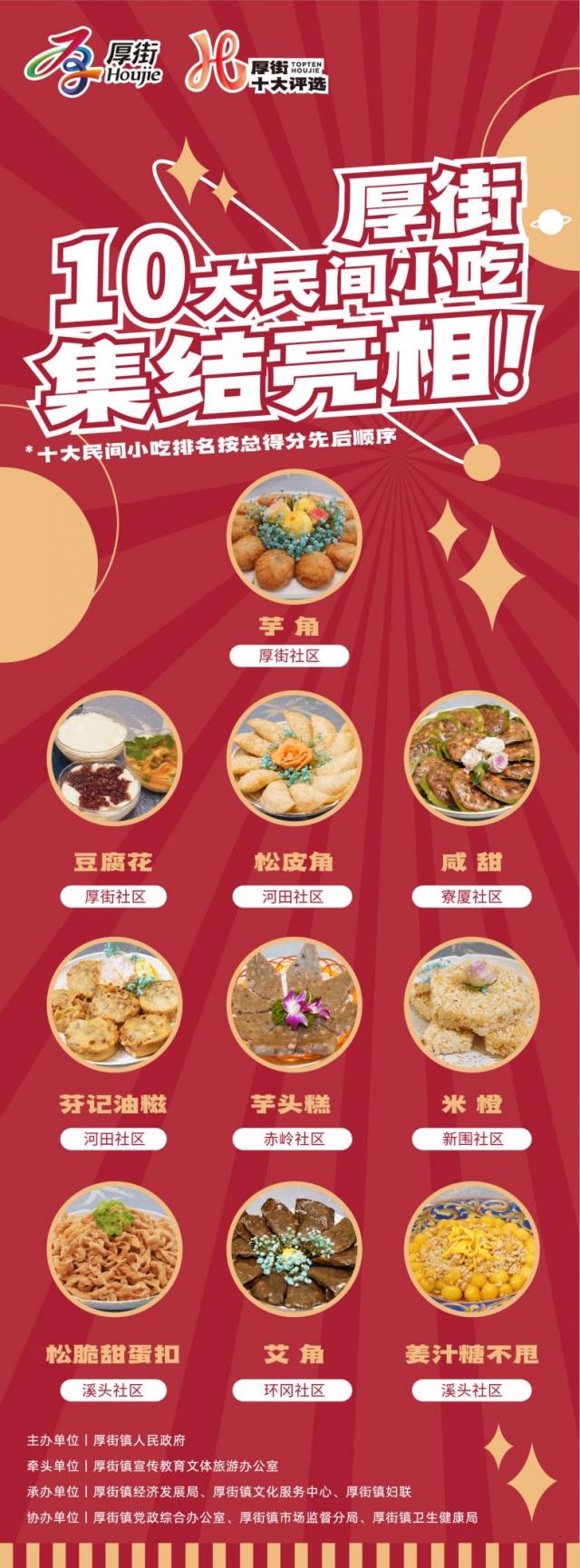 据了解,厚街十大评选活动采取线上报名、线上投票、专家评委团线下到店评选以及集中评选形式,分别评选产生具有厚街特色、代表性的厚街十大名手信礼、厚街十大名菜、厚街十大民间小吃三大深受广大厚街市民喜爱与熟悉的权威性美食推介榜单。