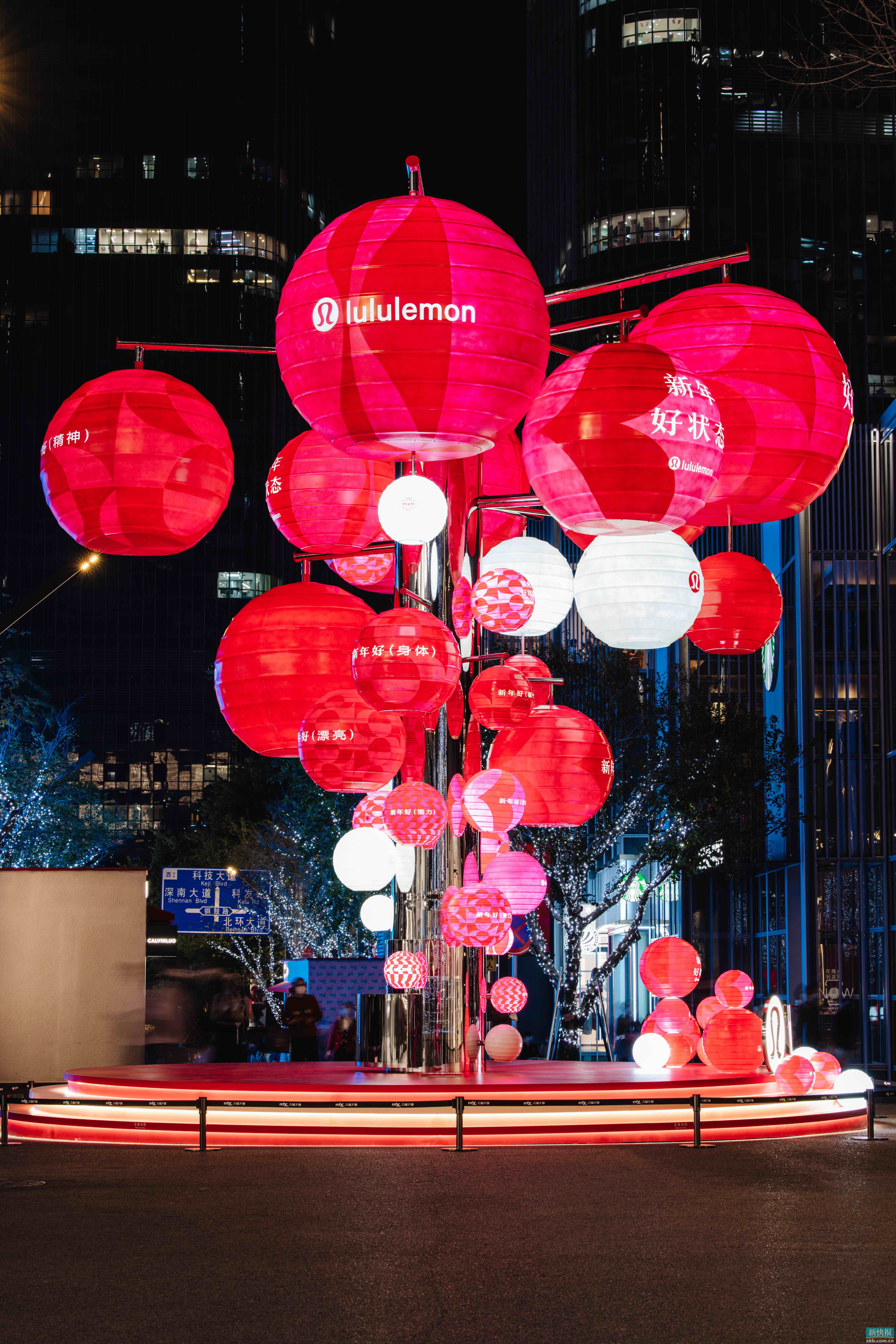 为迎农历新年,lululemon特别打造了一组新春灯笼巨型装置,由1个主灯笼装置和4个延伸灯笼装置组成,在长达156米的万象天地高街营造出绮丽的节日氛围。其中,主灯笼装置位于高街中心,由54个大小不一的灯笼错落排列而成,倒三角形的结构代表着新年蒸蒸日上的寓意。每个灯笼上皆满载祝福语,祝愿所有人都能拥有身心愉悦的新一岁。