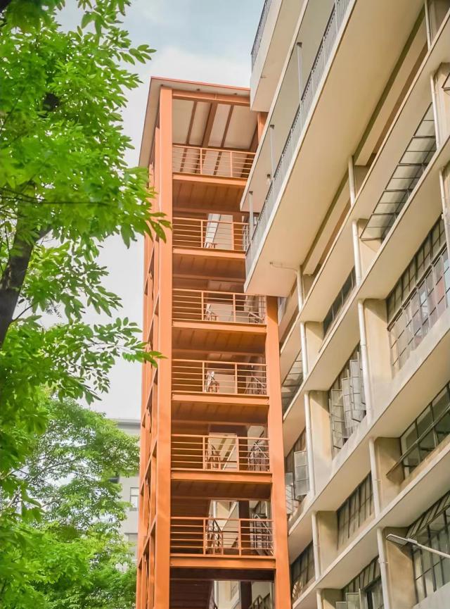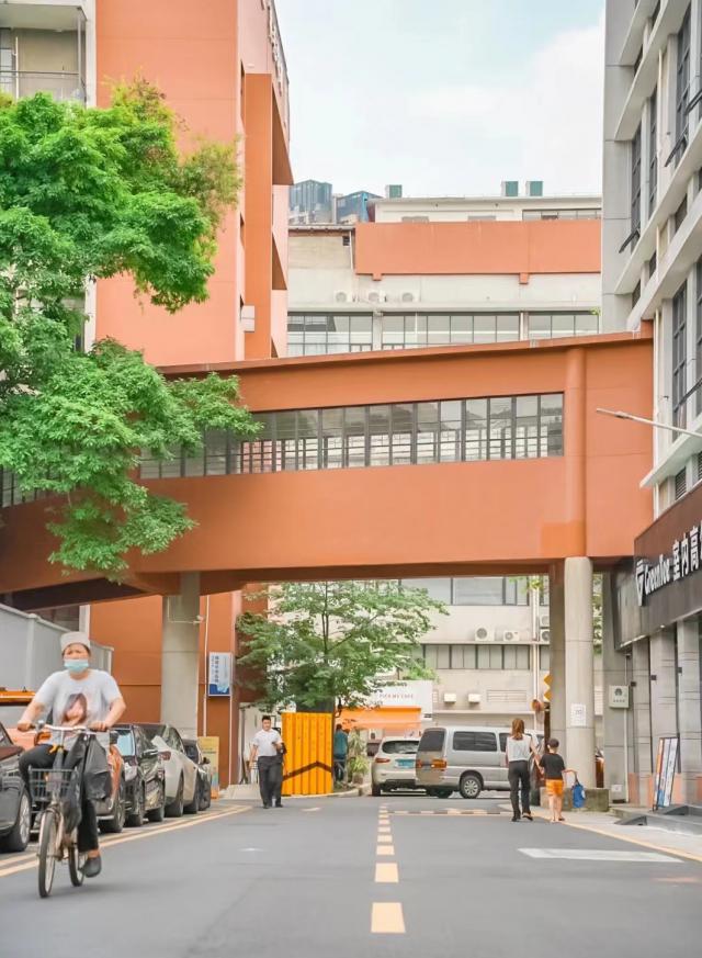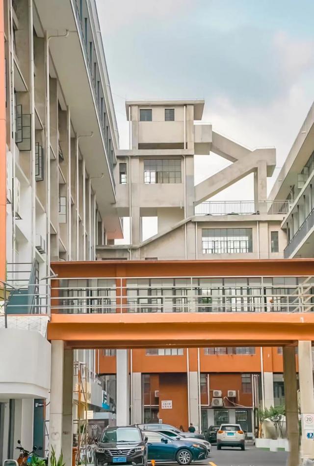 橙白相间的外墙,楼梯、走廊,构成一座浪漫的"日落色"创意园,如同夕阳洒落其中。