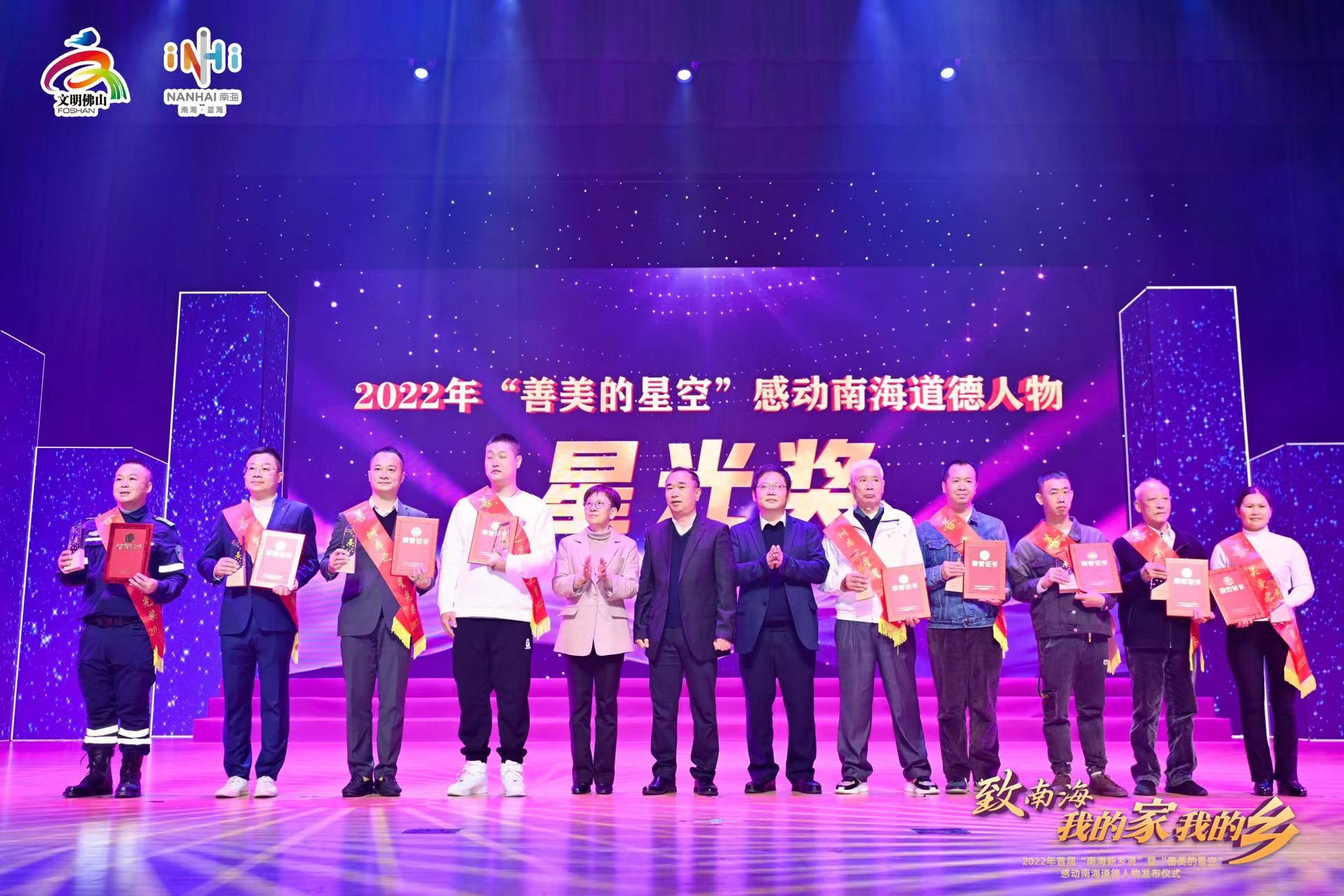为充分发挥先进典型示范带动作用,引领南海道德文化建设,强化南海区群众性精神文明创建活动品牌,南海区文明委自7月份以来组织开展了“善美的星空”——2022感动南海道德人物宣传推介活动。最终,经过社会各界及单位推荐、评委会初审、网络点赞、媒体评议、评委会终审等环节,择优评出“善美的星空”——2022感动南海道德人物19名,其中“善美之星”8名,星光奖11名。