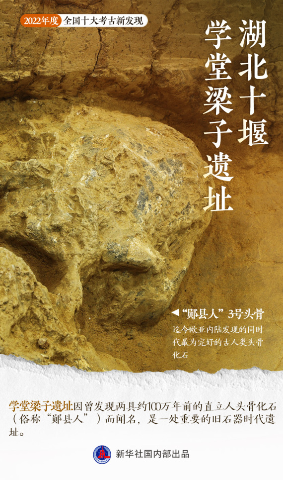 继1989、1990年发现“郧县人”1号、2号头骨化石后,2022年5月18日,在距“郧县人”1号头骨发现地不远处,“郧县人”3号头骨面世。同年12月3日,“郧县人”3号头骨在学堂梁子遗址被顺利提取出土,随后进入修复和研究环节。