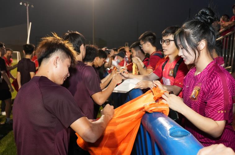 当队伍训练结束,球迷们涌入场地内与喜欢的球员合影。一个拥抱一次击掌,说的都是加油和鼓劲的话语。
