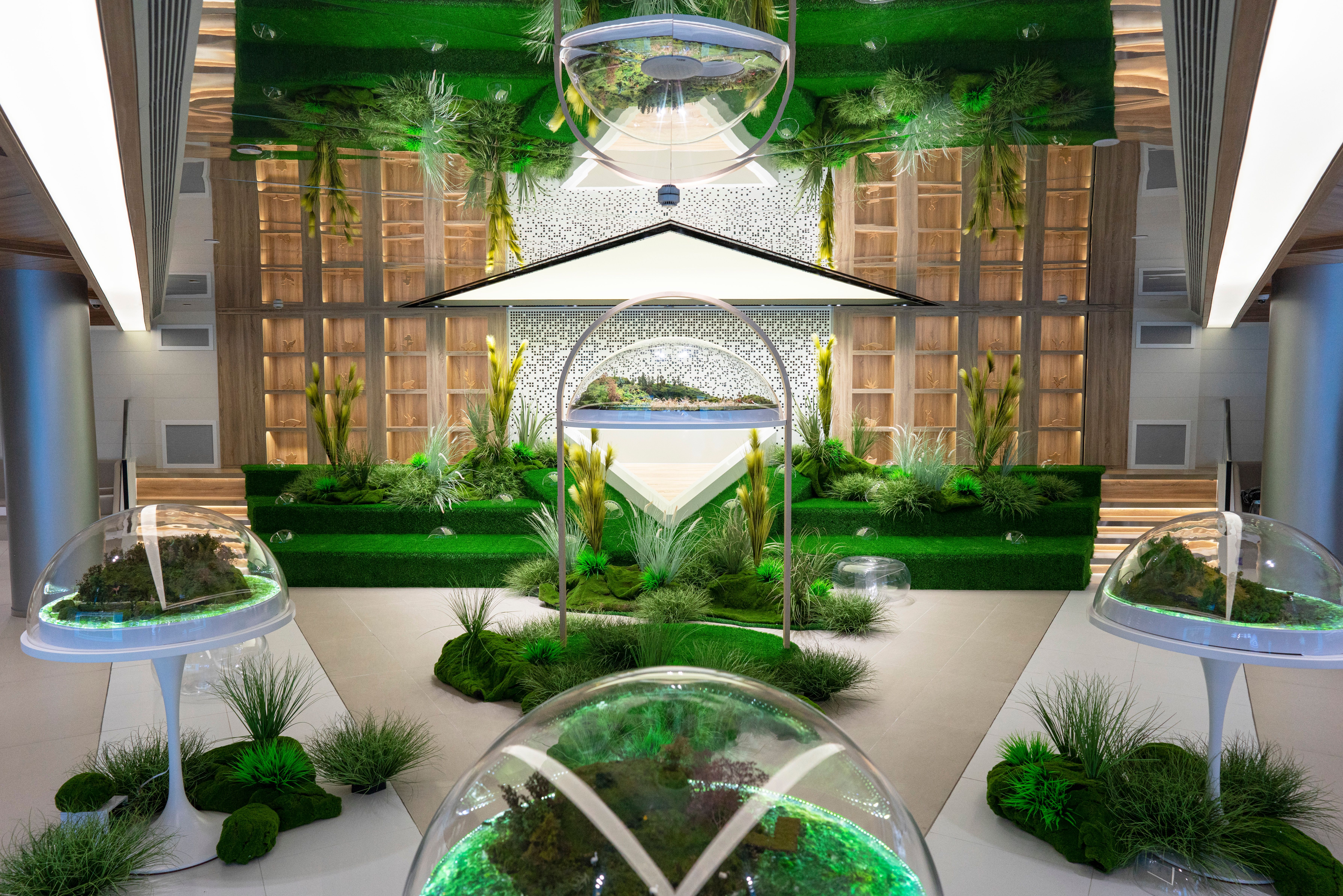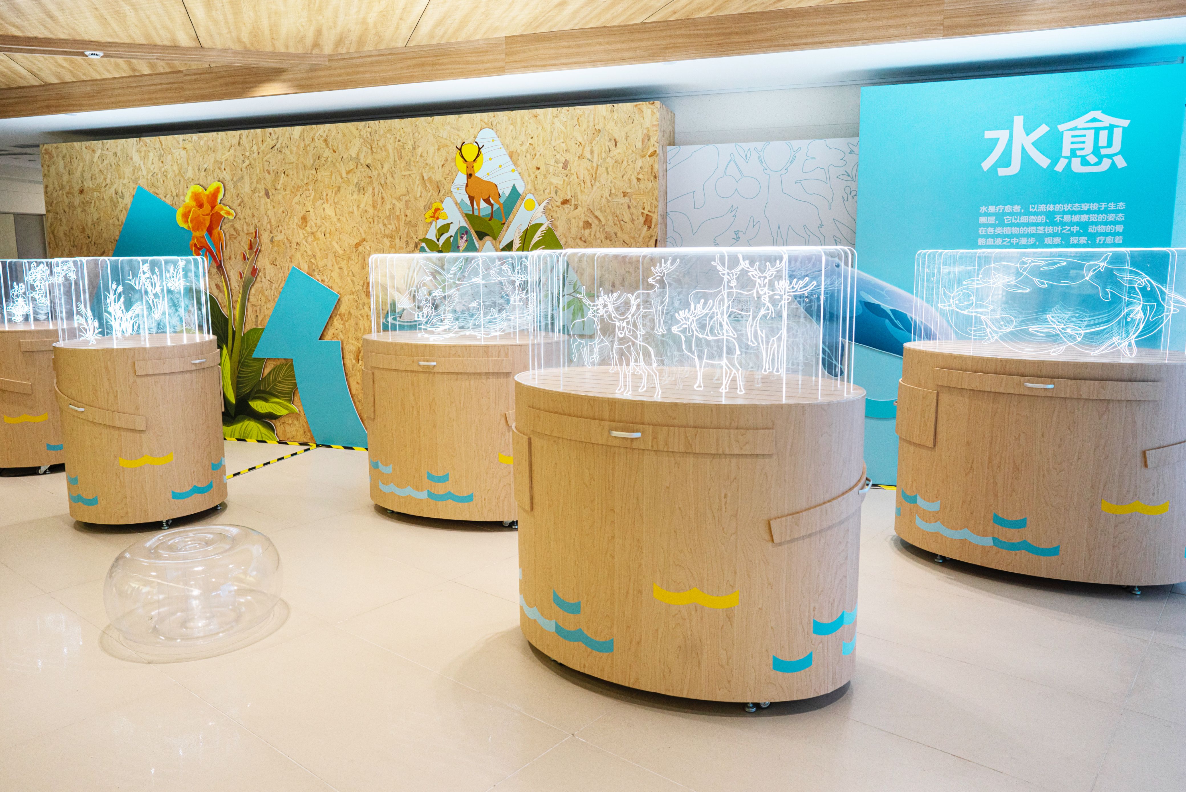 值得一提的是,【流变】区域作为展览的核心部分,由中心生态景观区、水愈装置区和愈水装置区三部分组成。中心生态景观区借助生态球以微缩景观的形式呈现水孕育出的生态环境。水愈装置区讲述了水“疗愈”自然万物,选取了麋鹿、江豚、芦苇等湿地保护项目所在地的动植物,利用剪影箱为观众带来视觉化、趣味化的知识科普,展现水资源对自然生态的哺育和滋养。愈水装置区则是从“水愈生态”到“人愈水”角度的转变,通过多功能箱和装置体验,以简单易懂的方式介绍水系治理、湿地修复以及可持续农业等多个水资源保护项目背后的原理,讲述人如何“愈水”的故事。
