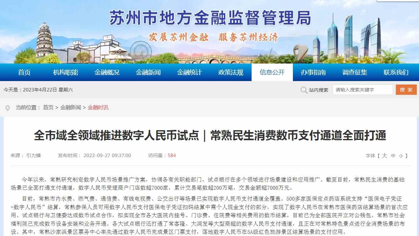 4月22日,据上海证券报报道,江苏省常熟市地方金融监督管理局和常熟市财政局日前印发《关于实行工资全额数字人民币发放的通知》。该通知称,从5月开始对常熟市在编公务员(含参公人员)、事业人员、各级国资单位人员实行工资全额数字人民币发放。