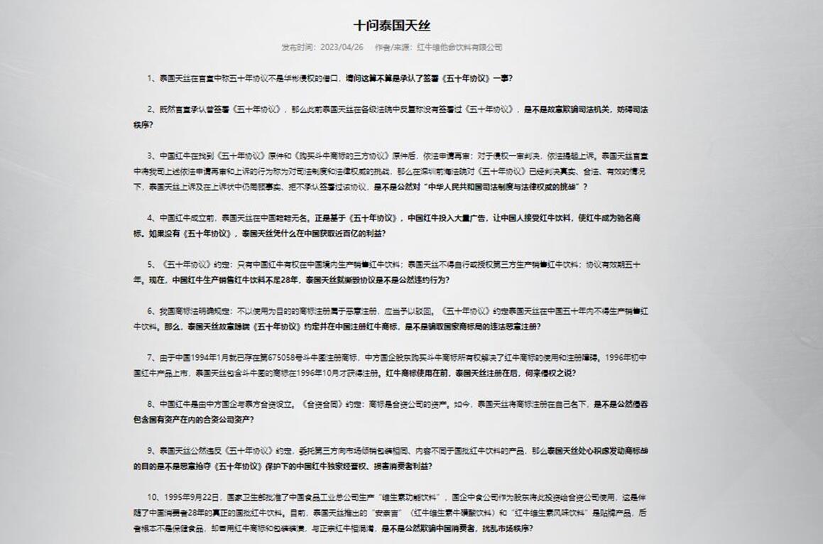 新快报讯 针对天丝近日连续公布的吉林高院和黑龙江高院一审判决,中国红牛日前频频作出回应,4月26日更是公开发文“十问泰国天丝”。双方的你来我往,也让已有7年的红牛商标之争在之前的较长时间的小打小闹之后,再次成为各界关注热点,且有愈演愈烈之势。