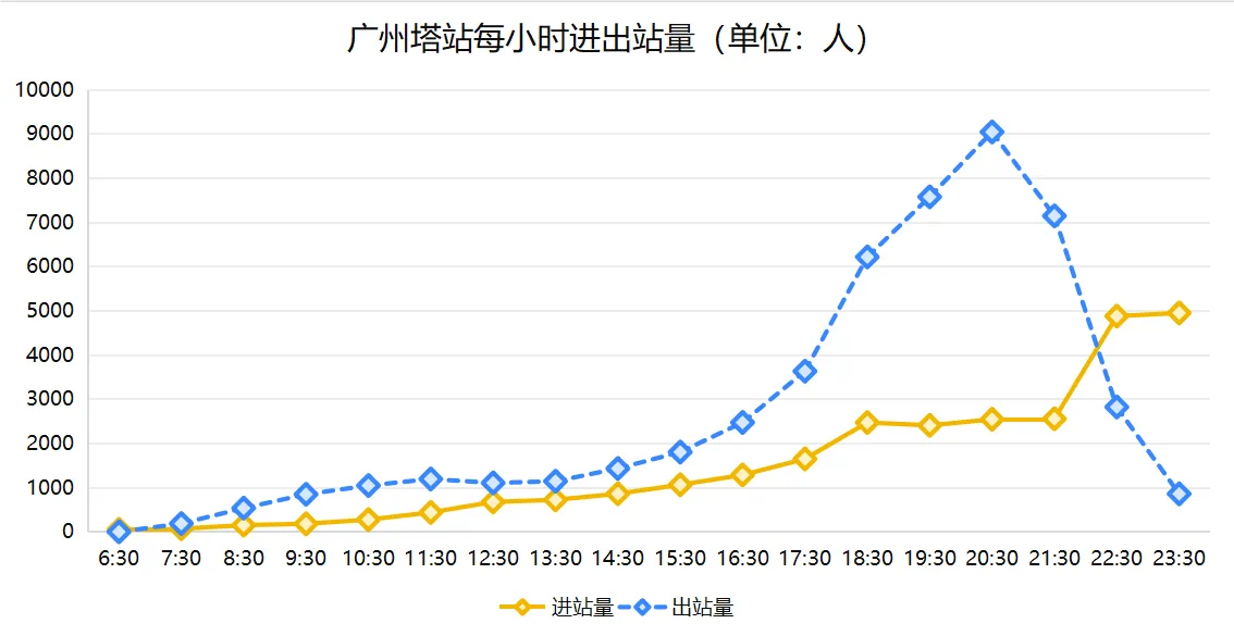 广州塔站邻近客村站、珠江新城站,也是三号线与APM线换乘站。受广州塔景区出游影响,2023年暑运以来,广州塔站日均进站量6.2万人次,出站量6.8万人次,客运量与2019年暑假同期对比增长7.8%。从进出站客流量分析,出站高峰时段为19:30-20:30;进站高峰时段为22:30-23:30。