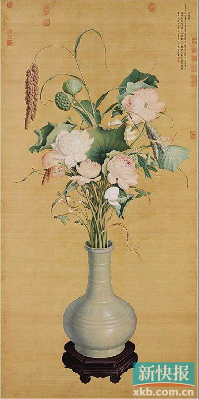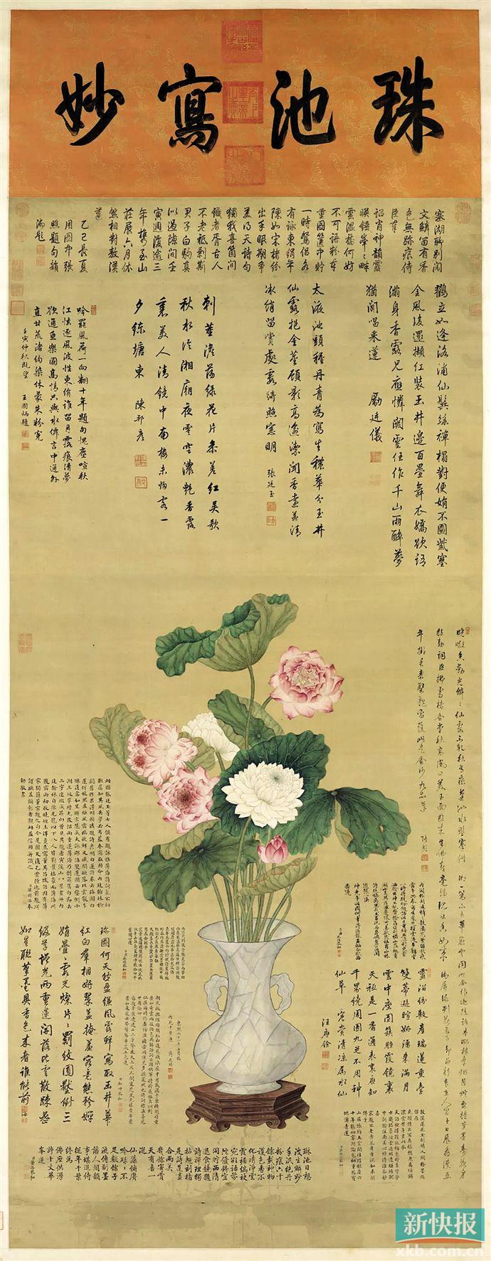 “这一推断更可解释,为何本拍品与雍正元年(1723年)郎世宁所作《聚瑞图》如斯接近。颇堪玩味的是,康熙之孙乾隆对绘于1722年的《敖汉千叶莲》也青眼有加,以至画成六十三年之后,乾隆五十年(公元1785年),他在行宫居停期间,再次令人取出此画观赏。他对画中莲花的惟妙惟肖深为赏识,并命皇子及在座五臣为此赋诗志之。”