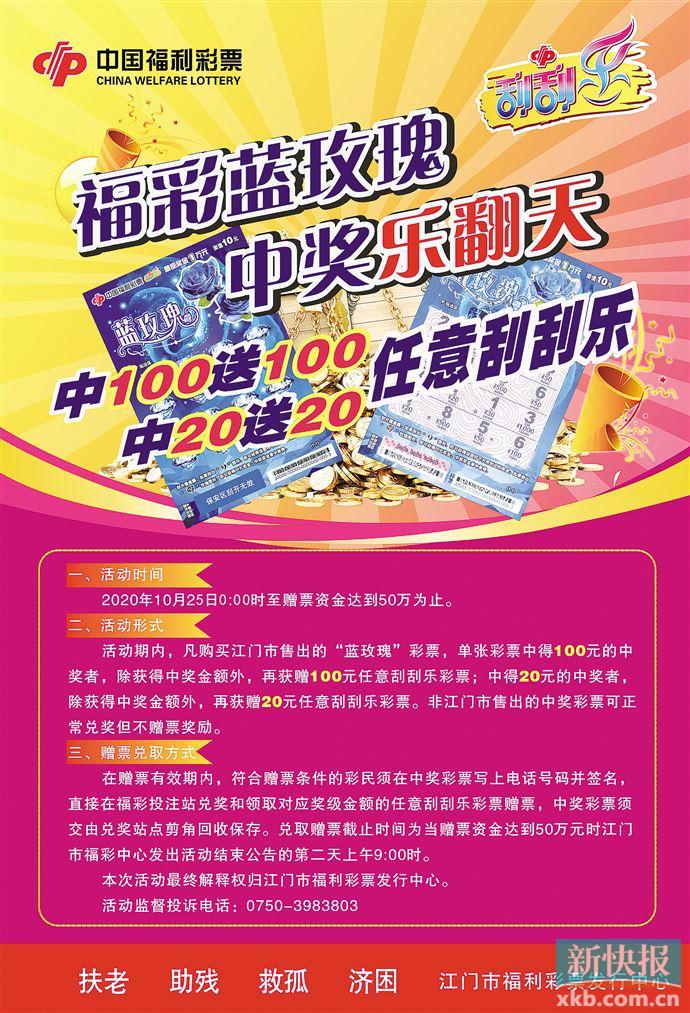 新快报讯 记者陆妍思 通讯员梁一鸣报道 为回馈彩民对江门刮刮乐即开型福利彩票的支持和厚爱,自10月25日0:00起,江门市福彩中心开展“福彩蓝玫瑰 中奖乐翻天”促销活动,50万元刮刮乐惠赠中奖彩民。