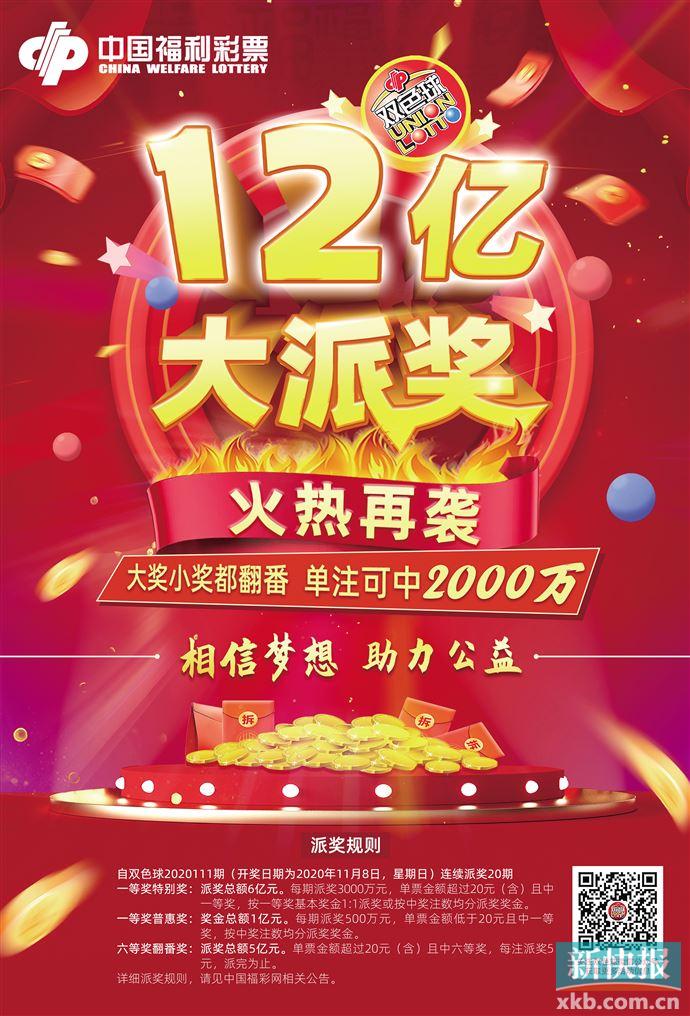 相信梦想,助力公益。中国福利彩票发行管理中心自11月8日起对双色球游戏开展派奖活动。本次活动自双色球第20111期(开奖日期为2020年11月8日)开始,连续派奖20期,派奖总金额达12亿元。