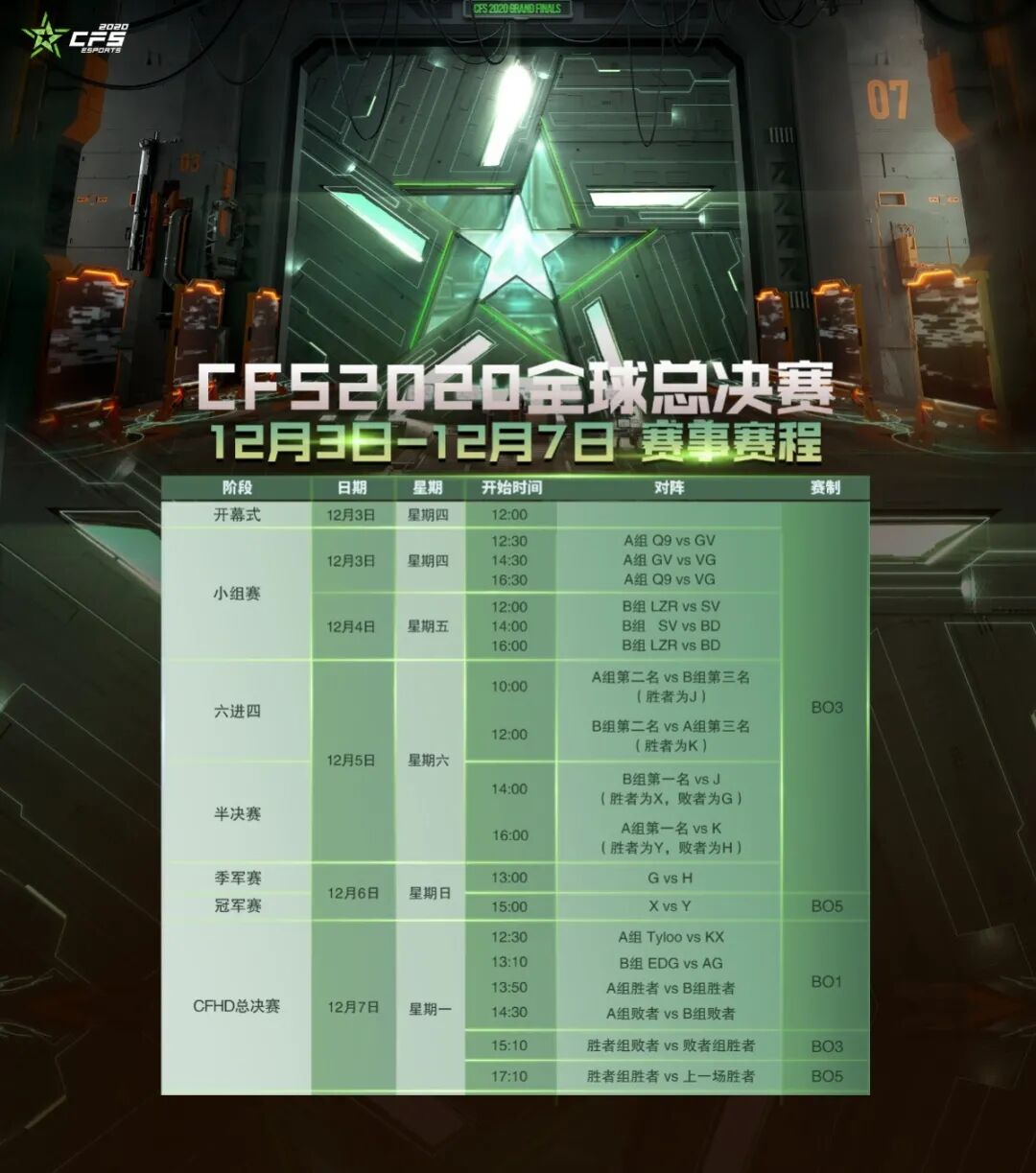 本次比赛将从12月3日开战至12月6日决出最后的冠军,共计六支队伍参赛,分别是A组的情久、GOLDEN V(GV)、VINCIT Gaming(VG)和B组的Lazarus(LZR)、SV以及Black Dragons(BD)。小组赛采取组内单循环赛bo3的赛制。12月3日和4日为小组赛阶段,12月5日将开始进行淘汰赛。12月6日率先进行季殿军的较量,而截止到季殿军赛,均为bo3赛制。随后本次比赛的终极大戏冠军赛紧接着开战,比赛采用bo5赛制,热情将冲破黑暗,期待两支中国队伍在各自小组的精彩表现。