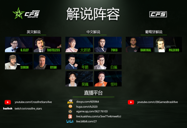 本次比赛的解说阵容可以说是十分豪华,白鲨、70KG、年鹏、怪咖、昊巍、大娇娇将作为本次CFS世界总决赛的中文解说。作为本次解说中唯一的一点红,大娇娇将用自己的专业知识、独到的见解为大家带来本次赛事解说。穿越火线终身荣誉会员白鲨、狙神70KG、曾经汉宫的灵魂人物中流砥柱年鹏对于比赛都有将用多年的赛事经验为大家仔细分析每一分、每一场战局。而怪咖和昊巍同样不落人后,个人特色十分鲜明,期待六位为我们带来声临其境的解说!