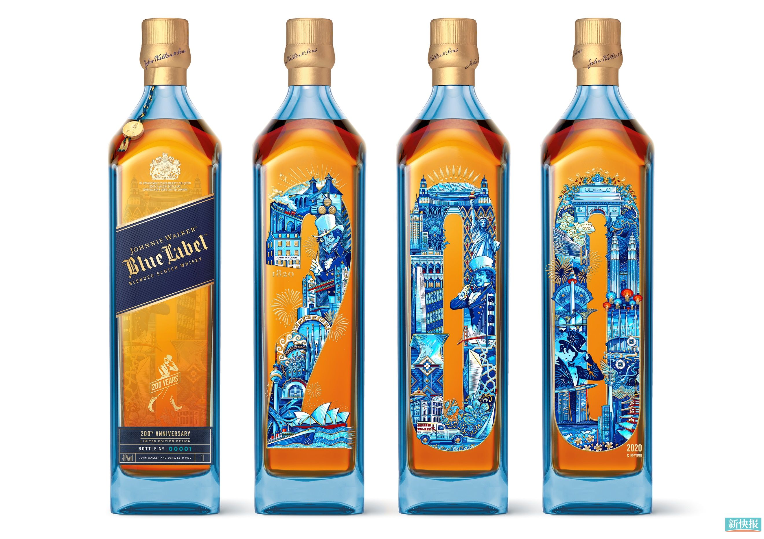 其中,尊尼获加蓝牌调配苏格兰威士忌限量设计款的瓶身四面各不相同,以精美的图案生动展示了尊尼获加自创始人起200年来的历程,向所有参与在这个自1820年起的传奇故事中的伟大城市和国家致敬寓意。
