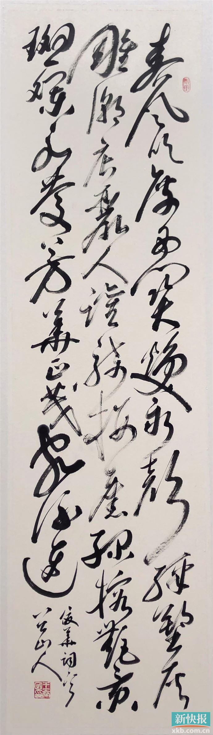王世国 狂草 杨俊华·西关永庆坊 释文:“春风吹度西关,焕新颜,彩塑灰雕潮店,丽人欢。骑楼旧,绿榕艳,景斑斓;永庆芳华正茂,客流连。”