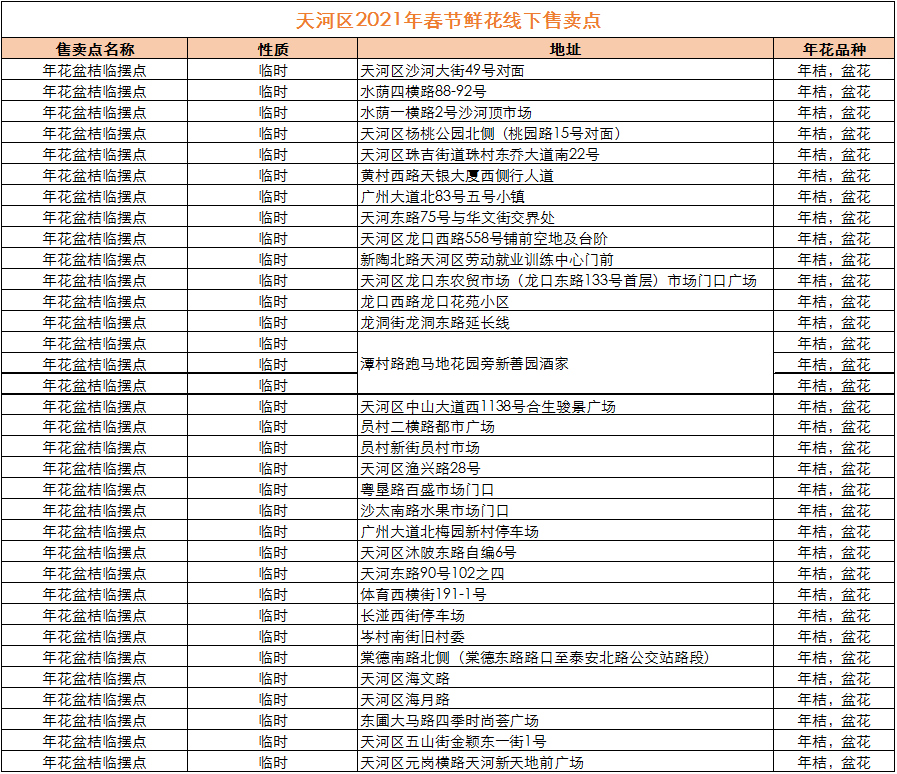 截至目前,全市11个区已明确设置的现场售卖点有153个(不含生产基地,后续将不断补充完善),其中临摆点114个,固定点39个。现场售卖点较多的区有南沙区41个、天河区34个、番禺区24个、海珠区20个、白云区16个。鲜花品种包括年桔、菊花、蝴蝶兰、桃花等春节主流花卉品种。