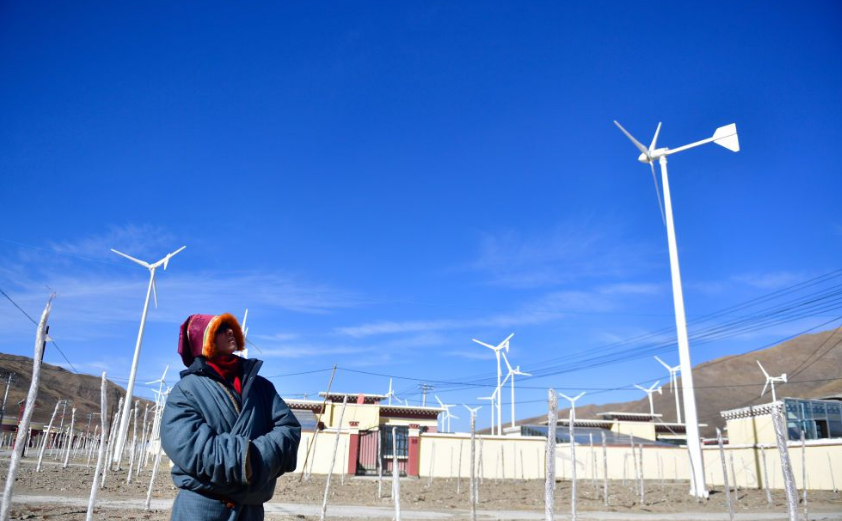 青海省果洛藏族自治州甘德县上贡麻乡隆亚村村民在查看搬迁点的风力发电机组运行情况。(新华社记者 张龙 摄)